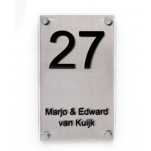 Deze plexiglas naamplaatjes bestaan uit een 2 mm dikke rvs-plaat en een 5 mm dikke plexiglas naambord waarin uw tekst en huisnummer worden gegraveerd en ingelakt in uw gekozen kleur. U heeft keuze uit verschillende inlakkleuren en lettertypes. Tevens worden er mooie rvs schroeven bijgeleverd wat uw naambord helemaal compleet maakt.