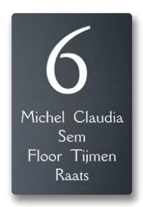 Wat onze antracietkleurige naamborden bijzonder maakt, is de toepassing van witte UV-print voor de tekst. Deze techniek zorgt voor een helder, stijlvol contrast op het matte oppervlak. Het resultaat is een elegante en moderne look die perfect aansluit bij een eigentijdse entree. Voor een strakke afwerking zijn aan de achterzijde twee metalen nokjes gelast, waardoor het bord onzichtbaar en zwevend aan de muur bevestigd wordt. Zo ontstaat een naambord dat niet alleen functioneel is, maar ook een exclusieve en verfijnde uitstraling heeft.