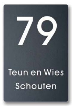 Wat onze antracietkleurige naamborden bijzonder maakt, is de toepassing van witte UV-print voor de tekst. Deze techniek zorgt voor een helder, stijlvol contrast op het matte oppervlak. Het resultaat is een elegante en moderne look die perfect aansluit bij een eigentijdse entree. Voor een strakke afwerking zijn aan de achterzijde twee metalen nokjes gelast, waardoor het bord onzichtbaar en zwevend aan de muur bevestigd wordt. Zo ontstaat een naambord dat niet alleen functioneel is, maar ook een exclusieve en verfijnde uitstraling heeft.