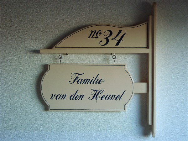 Prachtig uithangbord van hout. Wordt aan beide kanten beschilderd met naam en/of huisnummer.